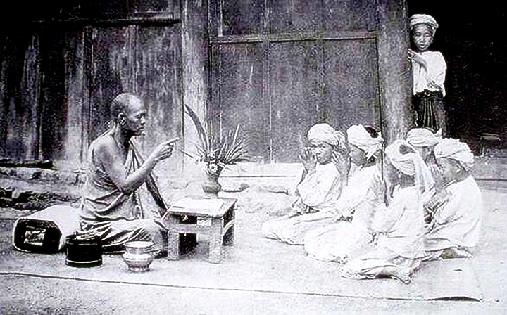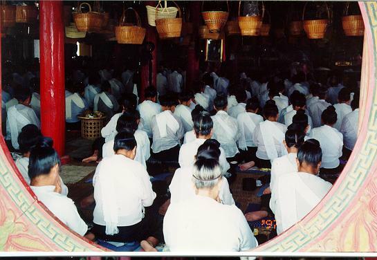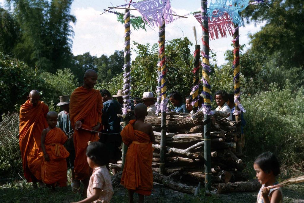 At the funeral home, people got together to express their sympathy and sorrow to the bereaved family. Family members usually cried out loud with songs of moaning to express their sorrow and grief. If the family members did not know how to cry with such a special song of moaning, they used to hire a professional moaner to moan in song on their behalf. Keeping the body at the funeral parlor was not a common practice because it was considered to degrade the dignity of the family and cause decay. The tent was put up in front of the house, meals were cooked and offered to the people who came to the funeral. People played cards and gambled at the funeral house, and the taxes were sometimes collected and used in funeral expenses. The general purpose of allowing people to play cards at the funeral house was not for gambling but to allow the people who stay with the bereaved family to warm the house, to spend time together the whole day and night without getting bored. Monks were invited to recite the scripture and hold the service at home before burial. The body was buried in the ground. For those who had the money, a small pagoda was erected on the tomb of the dead. Special alms offerings were done on the third and seventh days for the good of the spirit of the dead. One month after death, alms were offered again on behalf of the dead, believing that those alms would push the spirit of the dead into a better life. The body was carried in a coffin directly from home to the cemetery. Usually, four men carried the coffin. The man whose wife was pregnant was not allowed to carry the coffin for fear that the spirit of the dead might affect the baby in the womb of the wife.
