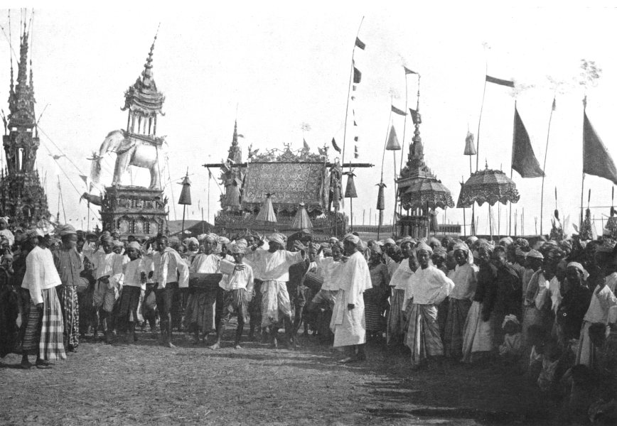 If an unmarried woman died, it was a custom to knock the bier or the coffin against a tree on the way to the burial ground. By doing so, it was hoped that in her next life she would not have the misfortune to die unmarried again. The funeral procession was led by the monks and followed immediately by all the men who had accompanied the procession, but women did not follow as far as to the graveyard. At the burial ground, the monks repeated sentences from the Buddhist scriptures during the final recitation. An earthenware bottle full of water was brought forward, and as the words were said, it was slowly emptied drop by drop onto the ground beside the open grave. When the water bottle was emptied, the coffin was lowered into the ground. Sometimes it was raised again and lowered again seven times. When it descended for the last time, a rope which had been placed with one end in the grave was pulled out with a jerk in the direction of the north to help the spirit of the dead begin his journey to Mount Meru, the great spirit mountain, which lay north of the world.