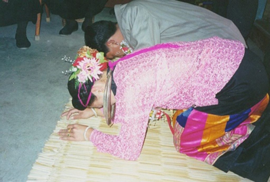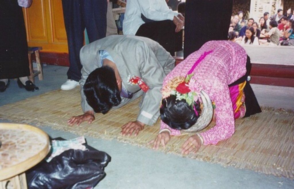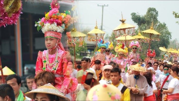 When a boy is about 8 years old, his parents used to send him to a monastery to be in the monkhood for one month. This is the celebration of novice ordination. The candidate-novice has his head shaven bald by a senior monk and wrapped with a head-cloth and donned a prince-like garment and put on valuable jewels and gems, and rides on a horse or is carried over the shoulders of a man and parades through the city to the monastery accompanied by gong-mong music. It is usually held in March-May. Once the boy has entered monkhood for a month, he has accomplished his Buddhist sacred duty. He also gets a monk’s name. The parents and people have to bow down before him and pay homage to him when he is wearing the yellow robe during the monkhood.