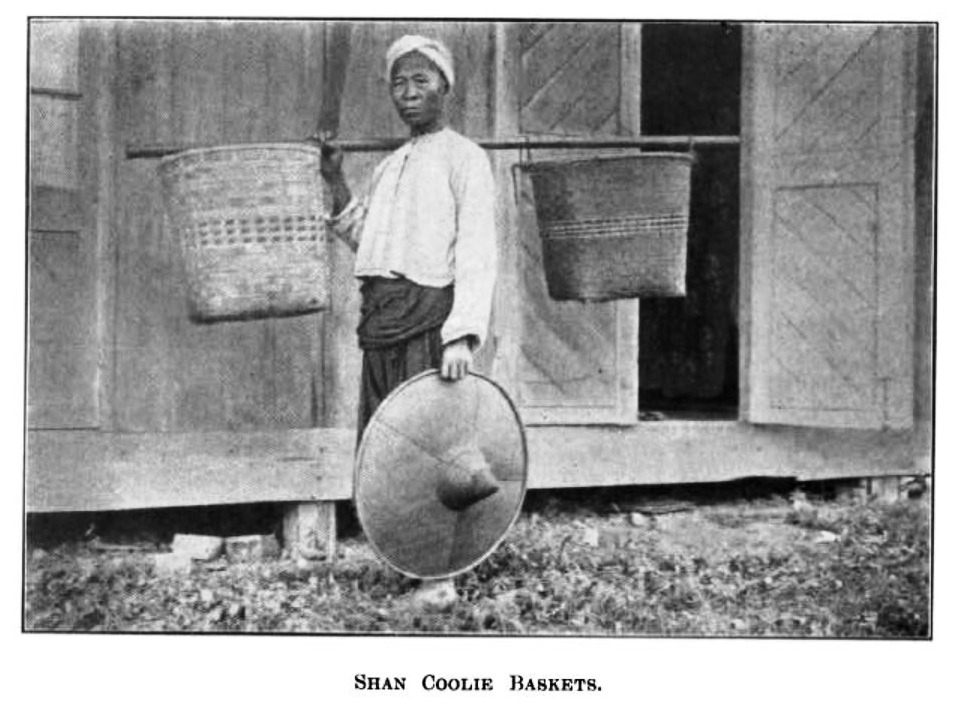It is surprising that, without any calendar or newspaper to refer to, on that special day, people began to arrive early from the hills and outlying villages. Others who have to walk thirty or forty miles prefer to arrive on the previous evening so that they may rest and sleep before the business day begins. Traders carry their goods on their shoulders in two baskets of the same weight, nicely balanced, suspended from each end of a bamboo pole. There are plenty of vegetables and fruits in the Shan bazaars. In the meat market, which is served only by men, pork, fish, beef and chicken, frogs, and sometimes venison are sold. Live cows, buffalo, pigs, and horses are also sold on market day. Some foreign imported goods are also available. The market is open to the sky, and the people sit on tiny bamboo stools under the shade of their big hats or yellow paper umbrellas.