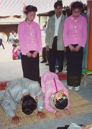 Shan are also superstitious. Various amulets can be found belonging to Shan people. Most of these amulets are worn around the neck, arm, wrists, and ankles, each one with its specific function for protection against the evils or as a talisman for good luck. Nearly all these superstitious symbols have previously received the blessing from the monks or witchdoctor; otherwise, they usually would not be considered effective and powerful. Some also believe in astrology. Full-moon day and the last day of the waning moon are considered as Sabbath day, and people must avoid making noise and working in the field. When the Sabbath, the people may encounter disasters. Whatever happened to them, they consider it as the consequences of karma. Good karma brings good things, and bad karma brings bad things. Man does not go under the rope, which hangs a woman’s skirt (သိၼ်ႈ) or women’s underwear. Going under such a rope causes the downgrading of man’s spiritual power. Shan strongly believes that their identity does not perish when they die. When a child is born, parents always wonder where the child’s life was in their last life. They believe that the spirits of the dead may go for ages to heaven or hell, but more often they are reborn on earth. They believe that the spirit returns willingly to its own human family, so a child may have in it the spirit of its dead brother or sister or father or grandmother or some other ancestor who died before he was born.[47] Shan do not sleep with their head directed to the North because they believe that it will lessen their fortune. They sleep with their head directed to the East.[48]